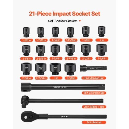 Case Color: Black,Socket Depth: Shallow,Socket Quantity: 16 SAESockets (1-5/8 in-3-1/8 in),Drive System: 1/2 Inch Drive,Number ofPieces: 21 Pieces,Item Model Number: TZ1021,Measurement System:SAE,Material: CR-V,Product Dimensions (L x W x H): 20.47 x 14.17 x4.13 in/520 x 360 x 105 mm,Hardness: HRC42-48,Case Material:Metal,Net Weight (with all accessories): 92.59 lbs/42 kg