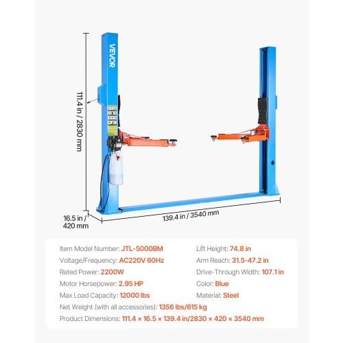 Voltage/Frequency: AC220V 60Hz,Motor Horsepower: 2.95 HP,Arm Reach:31.5-47.2 in,Color: Blue,Item Model Number: JTL-5000BM,Max LoadCapacity: 12000 lbs,Lift Height: 74.8 in,Rated Power:2200W,Material: Steel,Product Dimensions (L x W x H): 111.4 x 16.5x 139.4 in/2830 x 420 x 3540 mm,Net Weight (with all accessories):1356 lbs/615 kg,Drive-Through Width: 107.1 in
