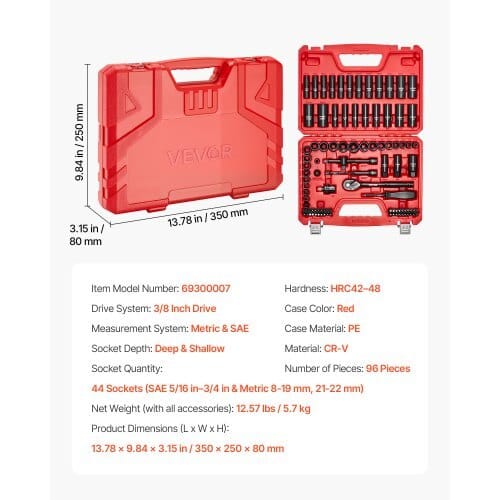 Case Color: Red,Socket Depth: Deep & Shallow,Socket Quantity: 44Sockets (SAE 5/16 in-3/4 in & Metric 8 mm-22 mm),Drive System: 3/8Inch Drive,Number of Pieces: 96 Pieces,Item Model Number:69300007,Measurement System: Metric & SAE,Material: CR-V,ProductDimensions (L x W x H): 13.78 x 9.84 x 3.15 in/350 x 250 x 80mm,Hardness: HRC42-48,Case Material: PE,Net Weight (with allaccessories): 12.57 lbs/5.7 kg