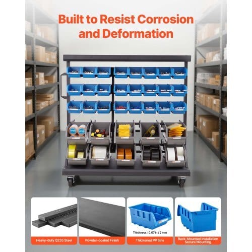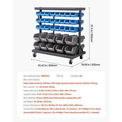 Tiers: 5,Main Materials: Frame: Q235 steel with powder coating;Bins: PP,Medium Bin Sizes: 6.46 x 4.09 x 2.99 in / 164 x 104 x 76mm,Large Bin Sizes: 9.37 x 5.83 x 5 in / 238 x 148 x 127mm,ItemModel Number: BR68VR,Max Load Capacity: Static (with casters): 500lbs / 226.8 kg; Dynamic (with casters): 360 lbs / 163 kg,ProductDimensions: 35.43 x 19.69 x 37.4 in / 900 x 500 x 950 mm,Max Loadper Tier: 88.18 lbs / 40 kg,Net Weight: 45.86 lbs / 20.8 kg,TotalBins: 68