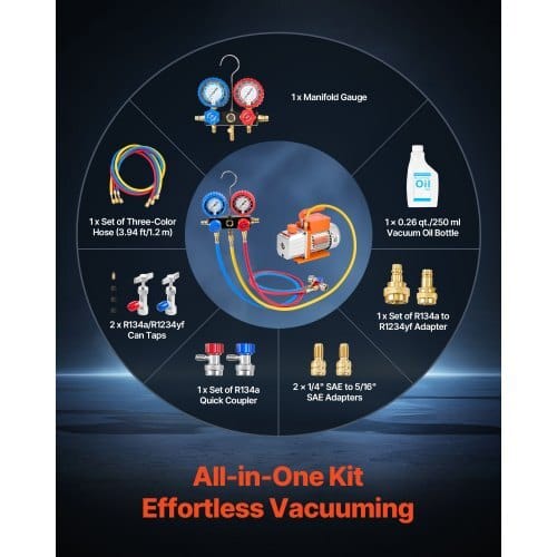 Ultimate Vacuum: 5 Pa/37.5 Microns,Item Model Number: RS-1.5,AirInlet Port: 1/4″ SAE,Free Air Displacement: 4.5 CFM/127L/min,Power: 1/3 HP, 250W,Compatible Refrigerants: R134a, R22,R410a, R1234YF, R32