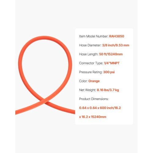Hose Length: 50 ft/15240 mm,Color: Orange,Item Model Number:RAH3850,Connector Type: 1/4″MNPT,Pressure Rating: 300 PSI,HoseDiameter: 3/8 in/9.53 mm,Product Dimensions: 0.64 x 0.64 x 600inch/16.2 x 16.2 x 15240 mm,Net Weight: 8.16 lbs/3.7 kg