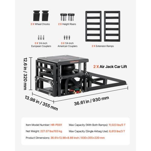 Max Capacity (With Both Ramps): 11,023 lbs/5 T,Max Capacity (SingleAirbag Use): 6,613 lbs/3 T,Item Model Number: HR-PD01,ProductDimensions: 36.61 x 13.98 x 8.66 in/930 x 355 x 220 mm,Net Weight:227.07 lbs/103 kg