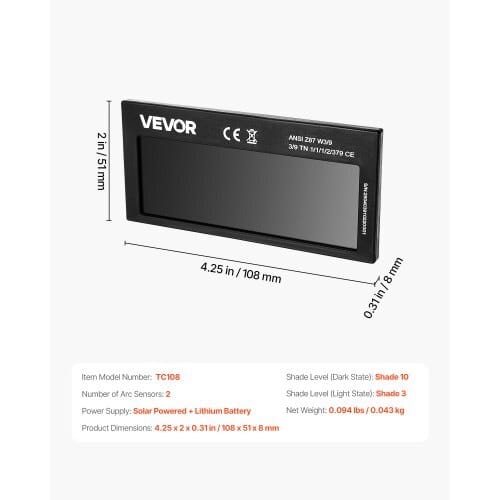 Shade Level (Light State): Shade 3 ,Item Model Number: TC108,ShadeLevel (Dark State): Shade 10,Number of Arc Sensors: 2,ProductDimensions: 4.25 x 2 x 0.31 in / 108 x 51 x 8 mm,Net Weight: 0.094lbs / 0.043 kg ,Power Supply: Solar Powered + Lithium Battery