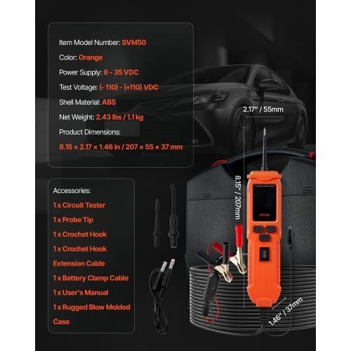 Test Voltage: (- 110) – (+110) VDC,Color: Orange,Item Model Number:SVM50,Shell Material: ABS,Product Dimensions: 8.15 x 2.17 x 1.46in/207 x 55 x 37 mm,Net Weight: 2.43 lbs/1.10 kg,Power Supply: 8 -35 DCV
