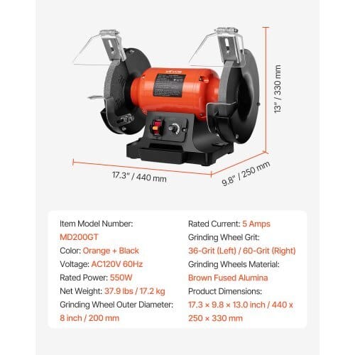 Color: Orange & Black,Voltage: AC120V 60Hz,Grinding Wheel Grit:36-Grit (Left) / 60-Grit (Right),Item Model Number:MD200GT,Grinding Wheel Outer Diameter: 8 inch / 200 mm,GrindingWheel Material: Brown Fused Alumina,Rated Power: 550 W,RatedCurrent: 5 Amps,Adjustablle Speed: 2000 – 3450 RPM VariableSpeed,Product Dimensions: 17.3 x 9.8 x 13.0 inch/ 440 x 250 x 330mm,Net Weight: 37.9 lbs / 17.2 kg