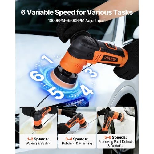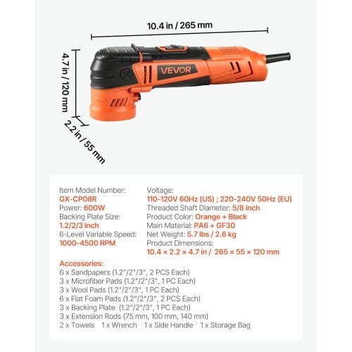 6-Level Variable Speed: 1000-4500 RPM,Backing Plate Size: 1.2/2/3inch ,Product Color: Orange + Black,Item Model Number:GX-CP08R,Product Dimensions: 10.43 x 2.17 x 4.72 in / 265 x 55 x120 mm,Net Weight: 5.7 lbs / 2.6 kg,Power: 600W,Main Material: PA6+ GF30