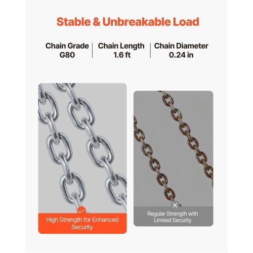 Max. Working Load (2-Leg Sling): 2000 lbs (0.9T),Item Model Number:0.6T,Chain Grade: G80,Single Chain Breaking Load: 15400 lbs(7T),Product Dimensions: 29 x 3 x 2.4 in/740 x 80 x 60 mm,ChainLength: 1.6 ft (50 cm),Net Weight: 6.17 lbs/2.8 kg,Main Material:Carbon Steel,Chain Diameter: 6 mm (0.24 in)
