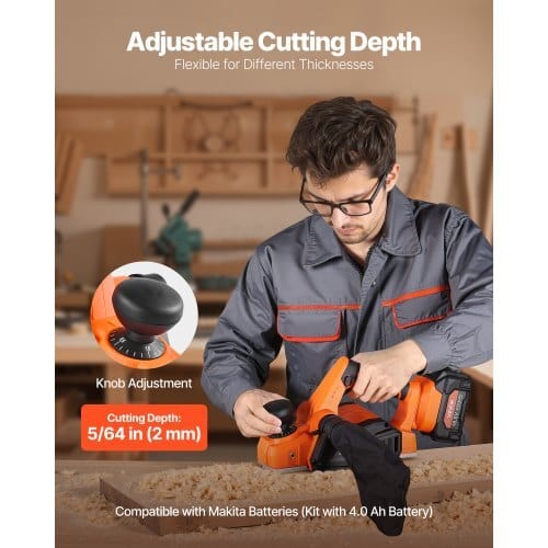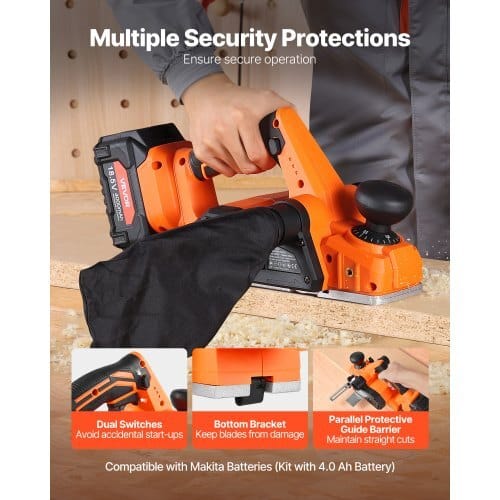 VEVOR Cordless Handheld Planer, 3-1/4-Inch Cut Width, 15000 RPMElectric Hand Wood Planer with 4.0 Ah 18V Lithium Battery,Brushless Motor, Adjustable Cut Depth, Dust Collection Bag, forWoodworking