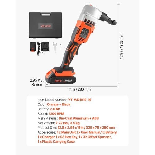 Speed: 1,200 RPM,Color: Orange + Black,Battery: 2.0 Ah,Item ModelNumber: YT-WD1818-16,Net Weight: 7.72 lbs/3.5 kg,Main Material:Die-Cast Aluminum + ABS,Product Size: 12.8 x 2.95 x 11 in/325 x 75x 280 mm