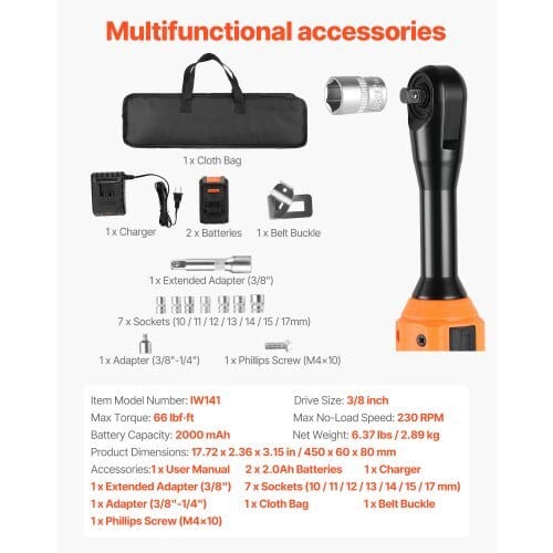 Battery Capacity: 2000 mAh,Max Torque: 66 lbf·ft,Item Model Number:IW141,Max No-Load Speed: 230 RPM,Product Dimensions: 17.72 x 2.36 x3.15 in / 450 x 60 x 80 mm,Net Weight: 6.37 lbs / 2.89 kg,DriveSize: 3/8 inch