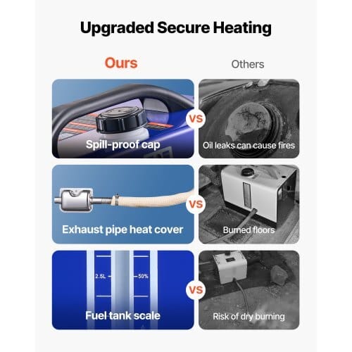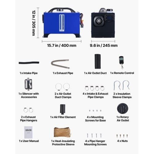 Fuel Consumption: 0.04 – 0.1 gal/h (0.17-0.48 L/h),Operating Noise:≤75 dB,Temperature Adjustment Range: 46.4-96.8℉ / 8-36℃ (10-leveladjustable),Item Model Number: XMZ-W-D4,Air-Fuel Ratio: 2400-4400rpm, 2.0-6.1 Hz,Operating Altitude: Below 9842 ft / 3000 m,FuelTank Capacity: 1.3 GAL / 5 L,Overheat Protection: ≥536℉ / 280℃,AirOutlet Diameter: 2.9 inch / 75 mm,Combustion Efficiency:≥90%,Product Dimensions: 15.7 x 9.6 x 12.0 inch / 400 x 245 x 305mm,Net Weight: 17.6 lbs / 8.0 kg (including all accessories)