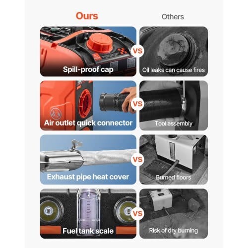 Fuel Consumption: 0.05 – 0.1 gal/h (0.18-0.42 L/h),Operating Noise:≤75 dB,Temperature Adjustment Range: 46-95℉ / 8-35℃,Item ModelNumber: S590136 S1,Air-Fuel Ratio: 2300-4400 rpm, 1.4-5.0Hz,Operating Altitude: Below 9842 ft / 3000 m,Fuel Tank Capacity:1.2 GAL / 4.5 L,Overheat Protection: ≥500℉ / 260℃,Air OutletDiameter: 2.9 inch / 75 mm,Combustion Efficiency: ≥85%,ProductDimensions: 20.0 x 9.0 x 17.6 inch / 505 x 227 x 446 mm,Net Weight:22.0 lbs / 9.95 kg (including all accessories)