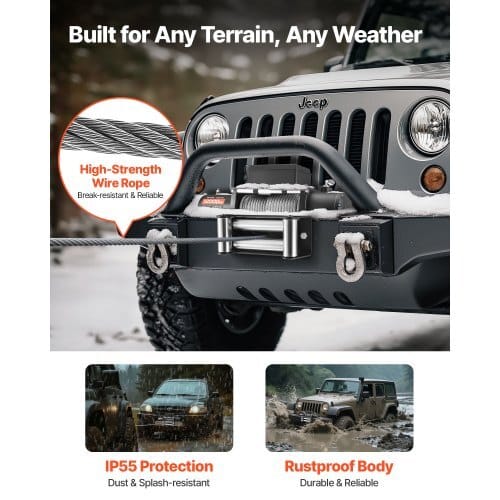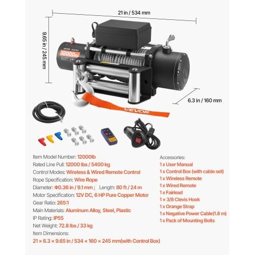 Rated Line Pull: 12000 lbs / 5400 kg,Rope Specification: Wire Rope,Diameter: Φ0.36 in / 9.1 mm; Length: 80 ft / 24 m,Main Materials:Aluminum Alloy, Steel, Plastic,IP Rating: IP55,Item Model Number:12000lb,Motor Specification: 12V DC, 6 HP Pure Copper Motor,GearRatio: 265:1,Item Dimensions: 21 x 6.3 x 8.5 in / 534 x 160 x 215mm (without Control Box),Control Modes: Wireless & Wired RemoteControl,Net Weight: 72.8 lbs / 33 kg