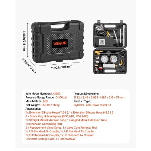 Product Type: Cylinder Leak-Down Tester Kit,Item Model Number:LX1202,Leak Rate Gauge Range: 0-100 psi,Product Dimensions: 11.22 x8.46 x 2.95 in / 285 x 215 x 75 mm,Net Weight: 3.52 lbs / 1.6kg,Main Material: ABS