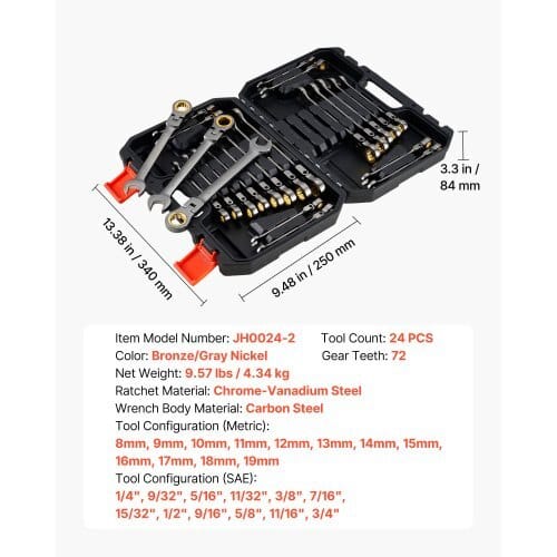 Ratchet Material: Chrome-Vanadium Steel,Color: Bronze/GrayNickel,Gear Teeth: 72,Item Model Number: JH0024-2,Wrench BodyMaterial: Carbon Steel,Net Weight: 9.57 lbs / 4.34 kg,Tool Count:24 PCS