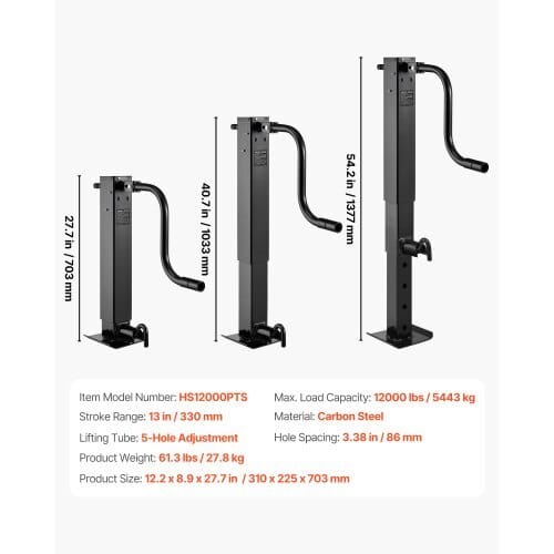 Item Model Number: HS12000PTS,Max. Load Capacity: 12000lbs / 5443kg,Product Weight: 61.3 lbs / 27.8 kg,Material: CarbonSteel,Lifting Tube: 5-Hole Adjustment, Hole Spacing: 3.38 in/86mm,Stroke Range: 13 in / 330 mm,Product Size: 12.2 x 8.9 x 27.7 in/ 310 x 225 x 703 mm