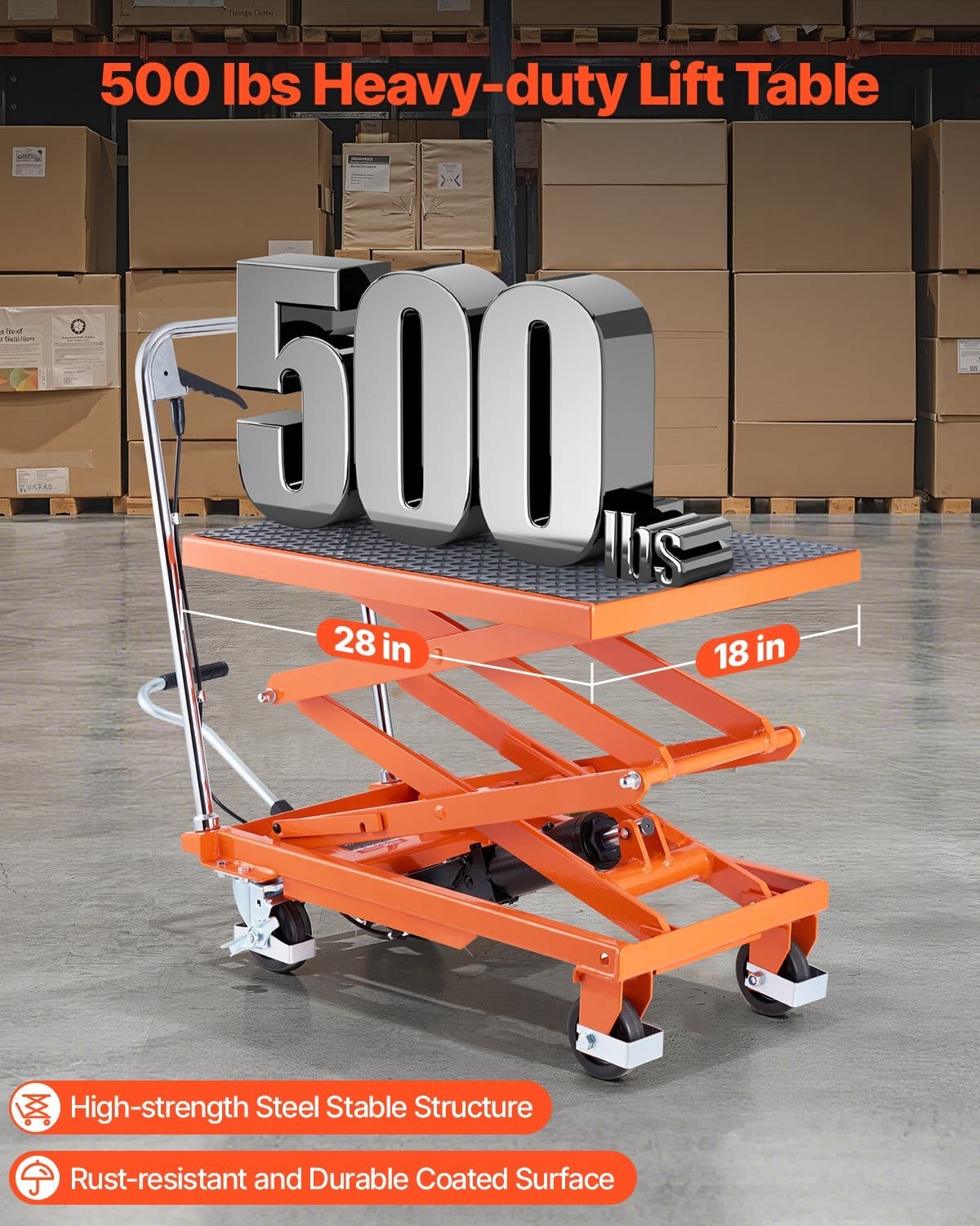 Hydraulic Lift Table, 500 lbs Capacity, 47.2″ Lifting Height, Double Scissor Lift Table Cart with 4 Wheels and Non-slip Pad, Manual Hydraulic Lifting Cart for Material Handling & Transportation
