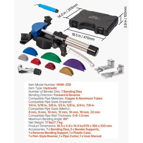 Bending Direction: Forward & Reverse,Compatible Pipe Materials:Copper & Aluminum Tubes,Number of Bending Dies: 7 Bending Dies,ItemModel Number: HHW-22B,Maximum Bending Angle: 90°,Item Type:Hydraulic,Compatible Pipe Sizes (Metric): 6 mm, 8 mm, 10 mm, 12 mm,16 mm, 19 mm, 22 mm,Compatible Pipe Wall Thickness: 0.6-1.5mm,Compatible Pipe Sizes (Imperial):1/4 in, 5/16 in, 3/8 in, 1/2in, 5/8 in, 3/4 in, 7/8 in