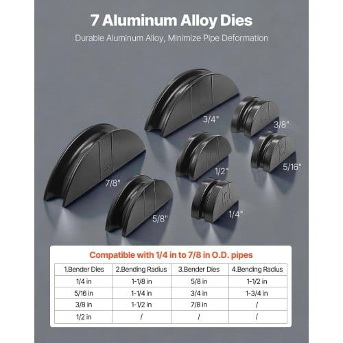 Bending Direction: Forward,Compatible Pipe Materials: Copper &Aluminum Tubes,Number of Bending Dies: 7 Bending Dies,Item ModelNumber: HHW-22B,Maximum Bending Angle: 90°,Item Type:Hydraulic,Compatible Pipe Sizes (Metric): 6 mm, 8 mm, 10 mm, 12 mm,16 mm, 19 mm, 22 mm,Compatible Pipe Wall Thickness: 0.6-1.5mm,Compatible Pipe Sizes (Imperial):1/4 in, 5/16 in, 3/8 in, 1/2in, 5/8 in, 3/4 in, 7/8 in