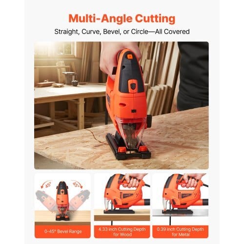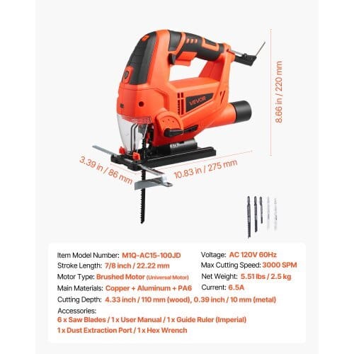 Max Cutting Speed: 3000 SPM,Cutting Depth: 4.33 inch / 110 mm(wood), 0.39 inch / 10 mm (metal),Main Materials: Copper + Aluminum+ PA6,Voltage: AC 120V 60Hz,Motor Type: Brushed Motor (UniversalMotor),Item Model Number: M1Q-AC15-100JD,Stroke Length: 7/8 inch /22.22 mm,Product Dimensions: 10.83 x 3.39 x 8.66 in / 275 x 86 x220 mm,Current: 6.5A,Net Weight: 5.75 lbs / 2.61 kg