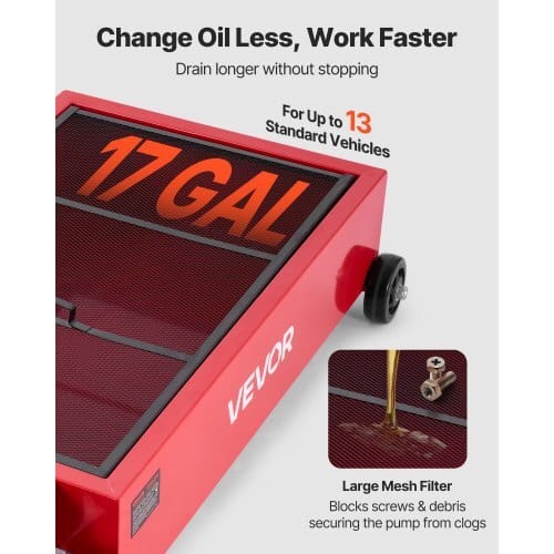 Oil Pan Capacity: 17 GAL,Product Dimensions (Max.): 39.76 x 23.62 x26.77 in / 1010 x 600 x 680 mm,Caster Wheels (with brakes)Diameter: 3 in / 76.2 mm; ,Item Model Number: FF-931-E(17Gal),Product Weight: 35.27 lbs / 16 kg,Max. Lift Height: 22.97ft / 7 m,Drain Hose Length: 7.22 ft / 2.2 m,Fixed Wheels Diameter:4 in / 101.6 mm