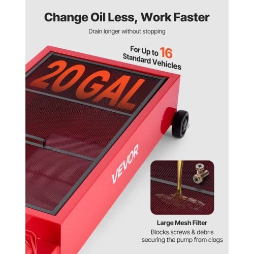 Oil Pan Capacity: 20 GAL,Hand Pump Max. Flow Rate: 16 L/min,ProductDimensions (Max.): 49.21 x 23.62 x 25.98 in / 1250 x 600 x 660mm,Caster Wheels (with brakes) Diameter: 3 in / 76.2 mm; ,ItemModel Number: FF-931-S-T (20Gal),Product Weight: 36.60 lbs / 16.6kg,Max. Lift Height: 9.84 ft / 3 m,Drain Hose Length: 7.22 ft / 2.2m,Fixed Wheels Diameter: 4 in / 101.6 mm