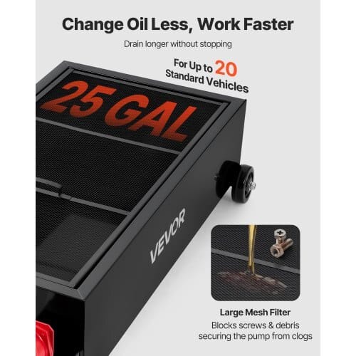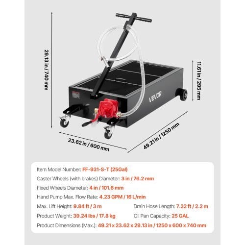 Oil Pan Capacity: 25 GAL,Hand Pump Max. Flow Rate: 16 L/min,ProductDimensions (Max.): 49.21 x 23.62 x 29.13 in / 1250 x 600 x 740mm,Caster Wheels (with brakes) Diameter: 3 in / 76.2 mm; ,ItemModel Number: FF-931-S-T (25Gal),Product Weight: 39.24 lbs / 17.8kg,Max. Lift Height: 9.84 ft /3 m,Drain Hose Length: 7.22 ft / 2.2m,Fixed Wheels Diameter: 4 in / 101.6 mm