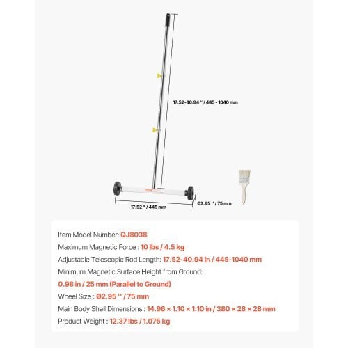Wheel Size: Ø2.95 in / 75mm,Main Body Shell Dimensions: 14.96 x1.10 x 1.10 in / 380 x 28 x 28 mm,Maximum Magnetic Force: 10 lbs /4.5 kg,Item Model Number: QJ8038,Product Weight: 2.37 lbs / 1.075kg,Adjustable Telescopic Rod Length: 17.52-40.94 in / 445-1040mm,Product Dimensions: 17.52 x 2.95 x 40.94 in / 445 x 75 x 1040mm,Minimum Magnetic Surface Height from Ground: 0.98 in / 25 mm(Parallel to Ground)