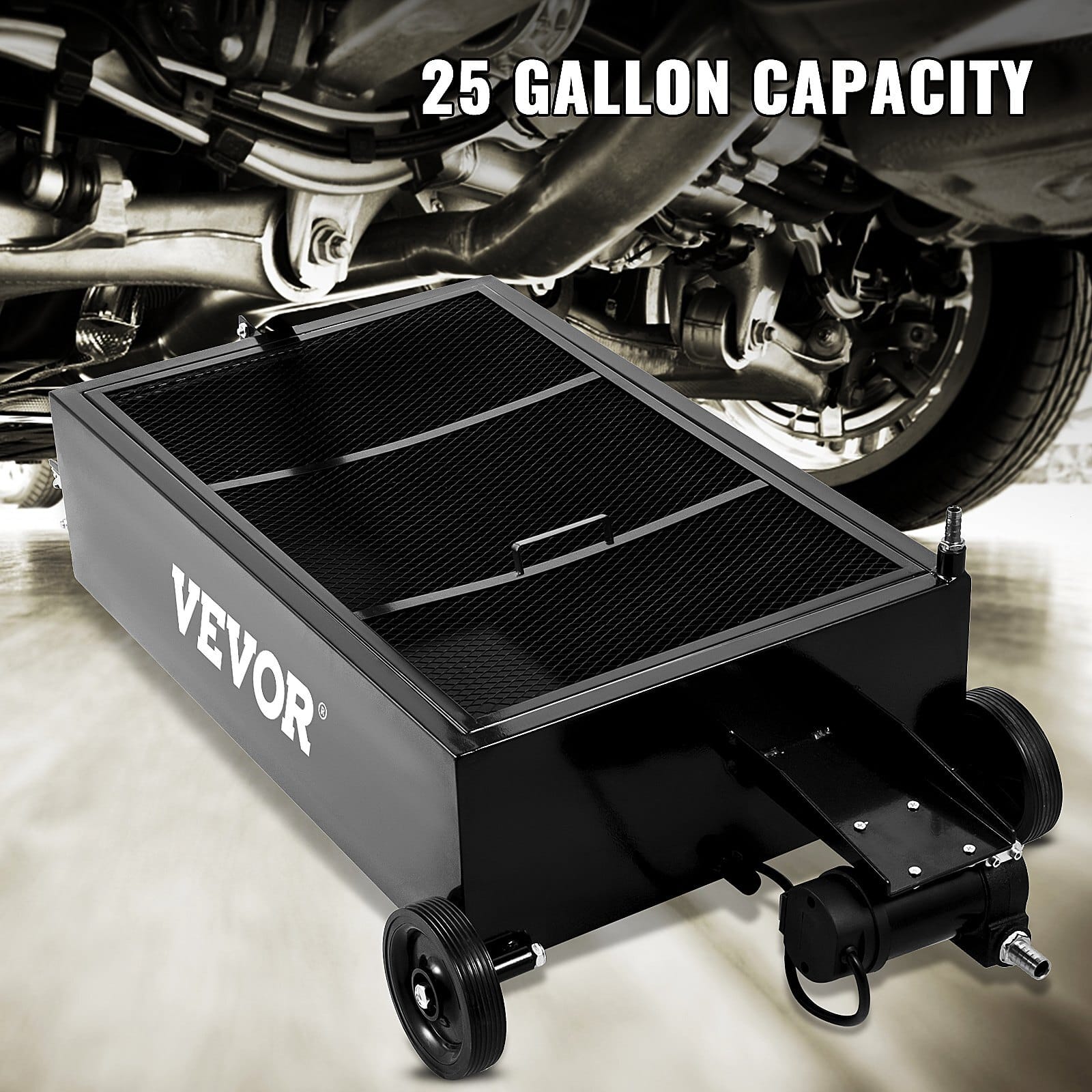 Oil Drain Pipe: 7.2′ / 2.2 M,Capacity: 25 Gallons / 95 L,FrontWheel Size: 6-Inch Fixed Wheel,Oil Discharge Section Port: 1/2Port,Rear Wheel Size: 3-Inch Universal Wheel,Fuel Tank Size: 31.5”x 19.7” x 8.3” / 80 x 50 x 21 cm,Oil Drain Pan Size: 47.2” x24.6” x 13.4” / 120 x 62.5 x 34 cm,Mesh Grille: 0.05” / 1.2mm,Steel Plate Thickness: 0.08” / 2 mm,Oil Draining Method:Electric Pump