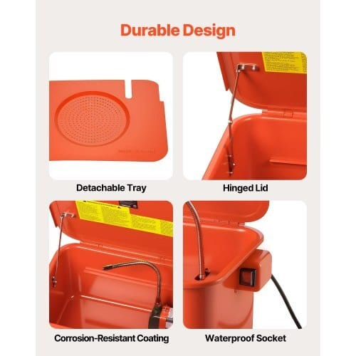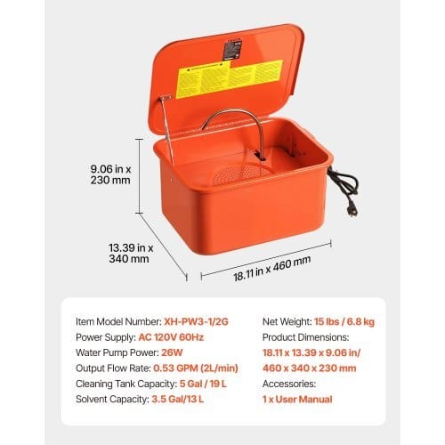 Cleaning Tank Capacity: 5 Gal / 19 L,Output Flow Rate: 0.4 GPM (1.5L/min),Water Pump Power: 26W,Solvent Capacity: 3.5 Gal / 13 L,ItemModel Number: XH-PW3-1/2G,Product Dimensions: 18.11 x 13.39 x 9.06in / 460 x 340 x 230 mm,Net Weight: 15 lbs / 6.8 kg,Power Supply:AC 120V 60Hz