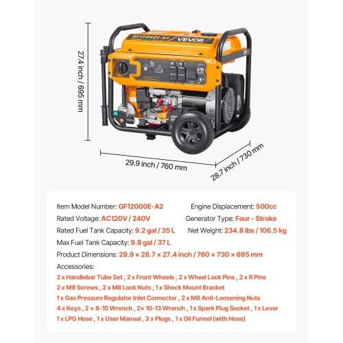Generator Type: Four-Stroke,Max Fuel Tank Capacity: 9.8 gal / 37L,Item Model Number: GF12000E-A2,Engine Displacement: 500cc,ProductDimensions: 29.9 x 28.7 x 27.4 inch / 760 x 730 x 695 mm,Rated FuelTank Capacity: 9.2 gal / 35 L,Net Weight: 234.8 lbs / 106.5kg,Rated Voltage: AC120V/AC240V