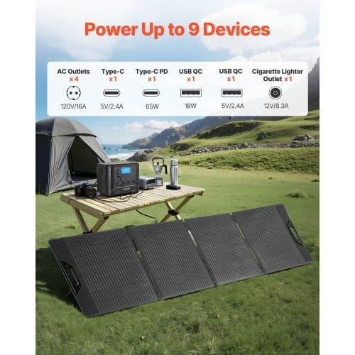 Solar Panel: 1 * 200W,Max Solar Input Power: 300W,Max AC InputPower: 500W,Solar Panel Net Weight: 12.35 lbs / 5.60 kg,BatteryType: LiFePO₄ Battery,Max AC Output Power: 1200W,Power Station NetWeight: 25.79 lbs / 11.70 kg,Solar Panel Dimensions: 80.02 x 16.93x 19.69 in / 2030 x 430 x 500 mm,Battery Capacity: 806Wh,Item ModelNumber: M9,Number of Output Ports: 9,Main Housing Material: ABS +PC,Power Station Dimensions: 11.42 x 8.66 x 9.06 in / 290 x 220 x230 mm