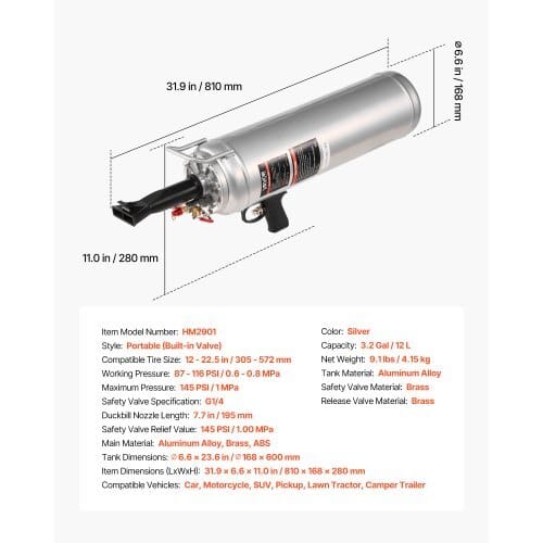 Compatible Tire Size: 12 – 22.5 in / 305 – 572 mm,Item Dimensions(LxWxH): 31.9 x 6.6 x 11.0 in / 810 x 168 x 280 mm,Release ValveMaterial: Brass,Color: Silver,Safety Valve Specification: G1/4,TankDimensions: ⌀6.6 x 23.6 in / ⌀168 x 600 mm,Safety Valve Material:Brass,Safety Valve Relief Value: 145 PSI / 1.00 MPa,Capacity: 3.2Gal / 12 L,Working Pressure: 87 – 116 PSI / 0.6 – 0.8 MPa,ItemModel Number: HM2901,Style: Portable (Built-in Valve),CompatibleVehicles: Car, Motorcycle, SUV, Pickup, Lawn Tractor, CamperTrailer,Net Weight: 9.1 lbs / 4.15 kg,Tank Material: AluminumAlloy,Maximum Pressure: 145 PSI / 1 MPa,Duckbill Nozzle Length: 7.7in / 195 mm,Main Material: Aluminum Alloy, Brass, ABS