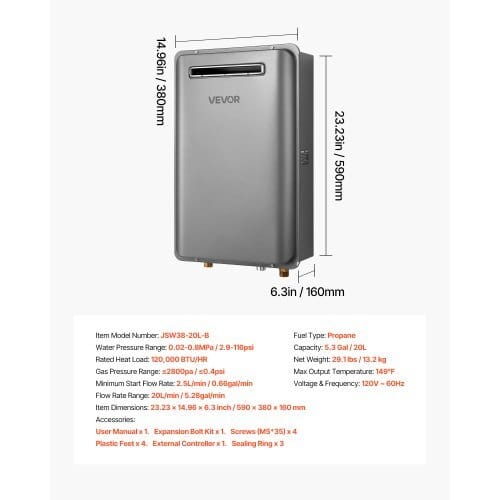Gas Pressure Range: ≤2800pa / ≤0.4psi,Capacity: 5.3 Gal / 20L,FlowRate Range: 20L/min / 5.28gal/min,Item Model Number:JSW38-20L-B,Item Dimensions: 23.23 x 14.96 x 6.3 inch / 590 x 380 x160 mm,Voltage & Frequency: 120V – 60Hz,Rated Heat Load: 120,000BTU/HR,Max Output Temperature: 149°F,Water Pressure Range:0.02-0.8MPa / 2.9-116psi,Net Weight: 29.1 lbs / 13.2 kg,MinimumStart Flow Rate: 2.5L/min / 0.66gal/min,Fuel Type: Propane