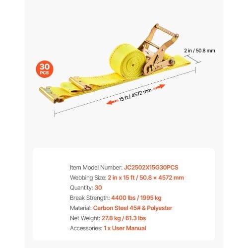 Webbing Size: 2 in x 15 ft / 50.8 x 4572 mm,Break Strength: 4400lbs / 1995 kg,Item Model Number: JC2502X15G30PCS,Quantity:30,Material: Carbon Steel 45# & Polyester,Net Weight: 27.8 kg /61.3 lbs,Rated Load: 1460 lbs / 662 kg