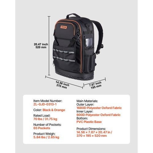 Main Materials:,Inner Layer: 600D Polyester Oxford Fabric,Color:Black & Orange,Outer Layer: 1680D Polyester Oxford Fabric,ItemModel Number: ZL-GJD-0313-1,Product Weight: 5.84 lbs / 2.65kg,Bottom: PVC Plastic Base,Product Dimensions: 14.56 x 7.67 x20.47 in / 370 x 195 x 520 mm,Number of Pockets: 65 Pockets,RatedLoad: 70 lbs / 31.75 kg