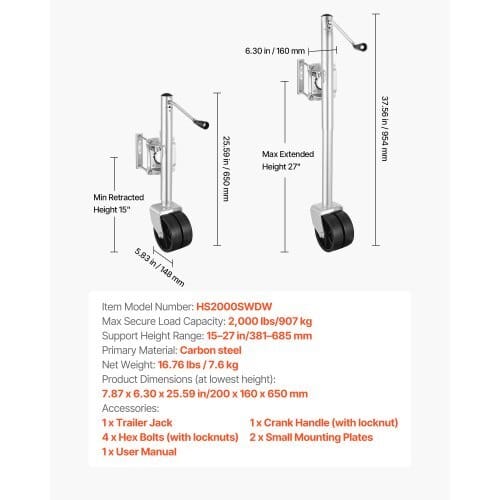 Primary Material: Carbon steel,Max Secure Load Capacity: 2,000lbs/907 kg,Support Height Range: 15-27 in/381-685 mm,Item ModelNumber: HS2000SWDW,Product Dimensions (at lowest height): 7.87 x6.30 x 25.59 in/200 x 160 x 650 mm,Net Weight: 16.8 lbs / 7.6 kg